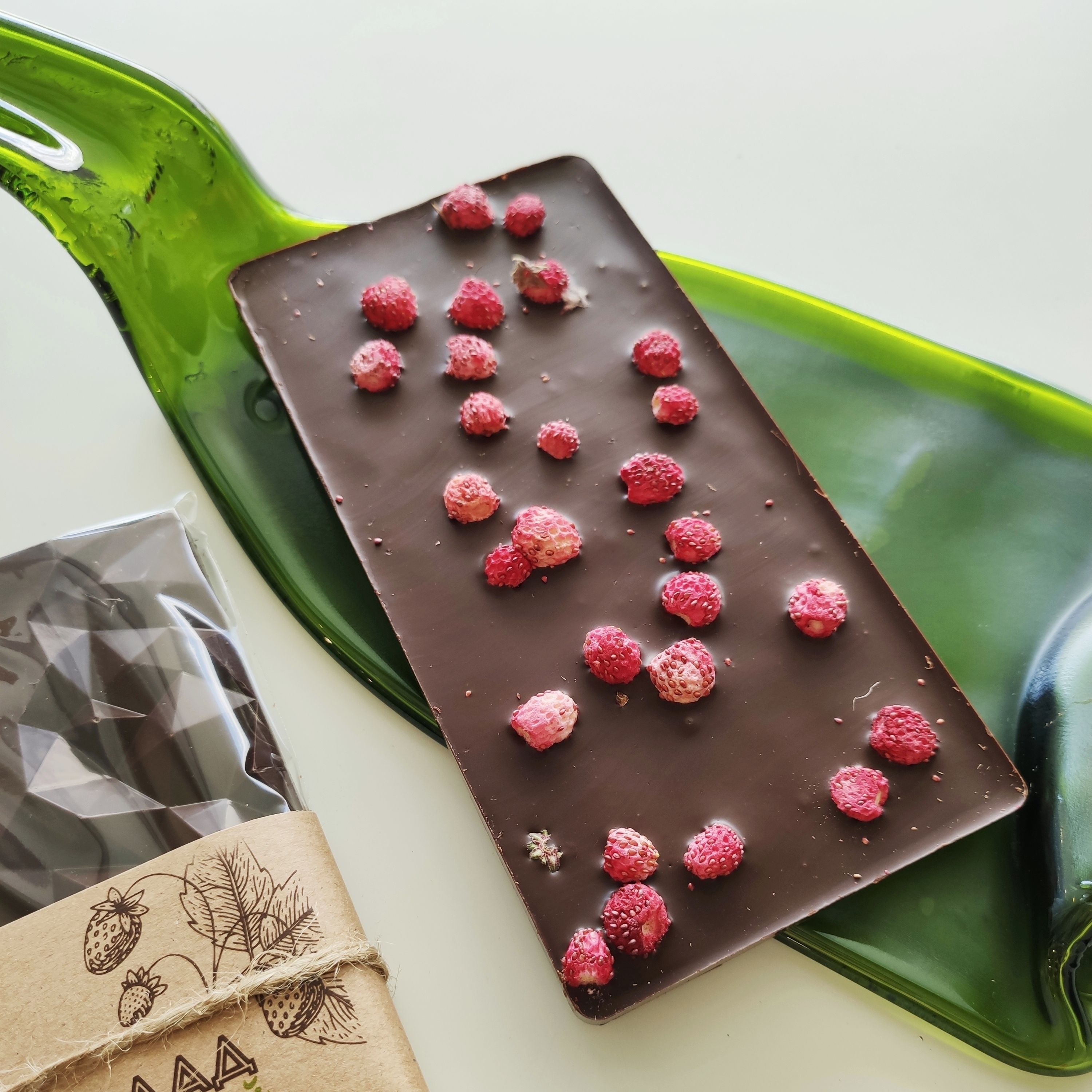 Состав: темный шоколад 66% (какао-бобы, какао-масло, тростниковый сахар, ваниль, соевый лецитин), лесная сублимированная земляника.