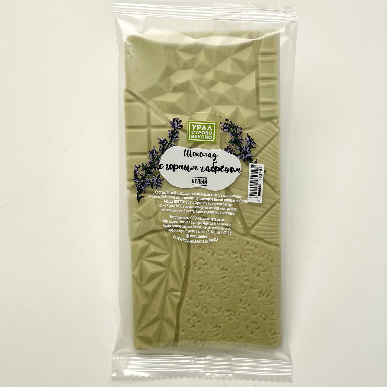 Состав: какао-масло, тростниковый сахар, сухое цельное молоко 26%, сублимированный чабрец.