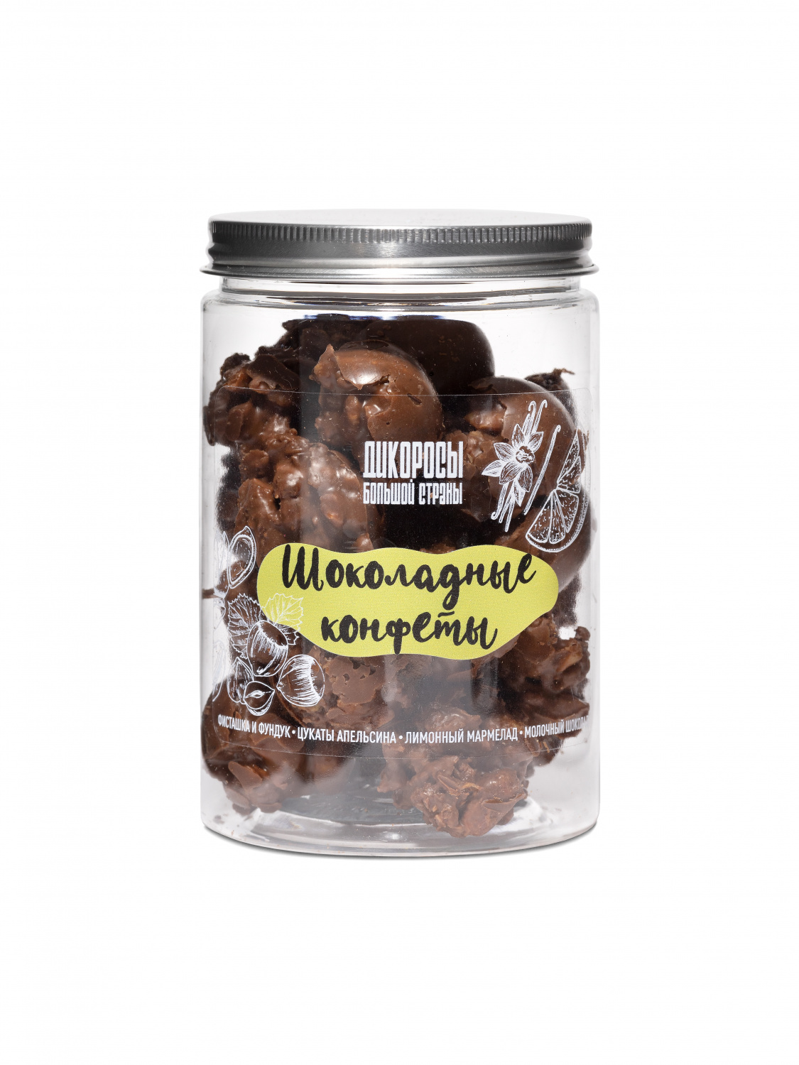 Состав: карамелизированная фисташка, фундук, молочный шоколад 47%(какао тёртое, тростниковый сахар, сухое молоко, какао масло, ваниль, соевый лецитин), цукаты апельсина, мармелад лимонно-ванильный.