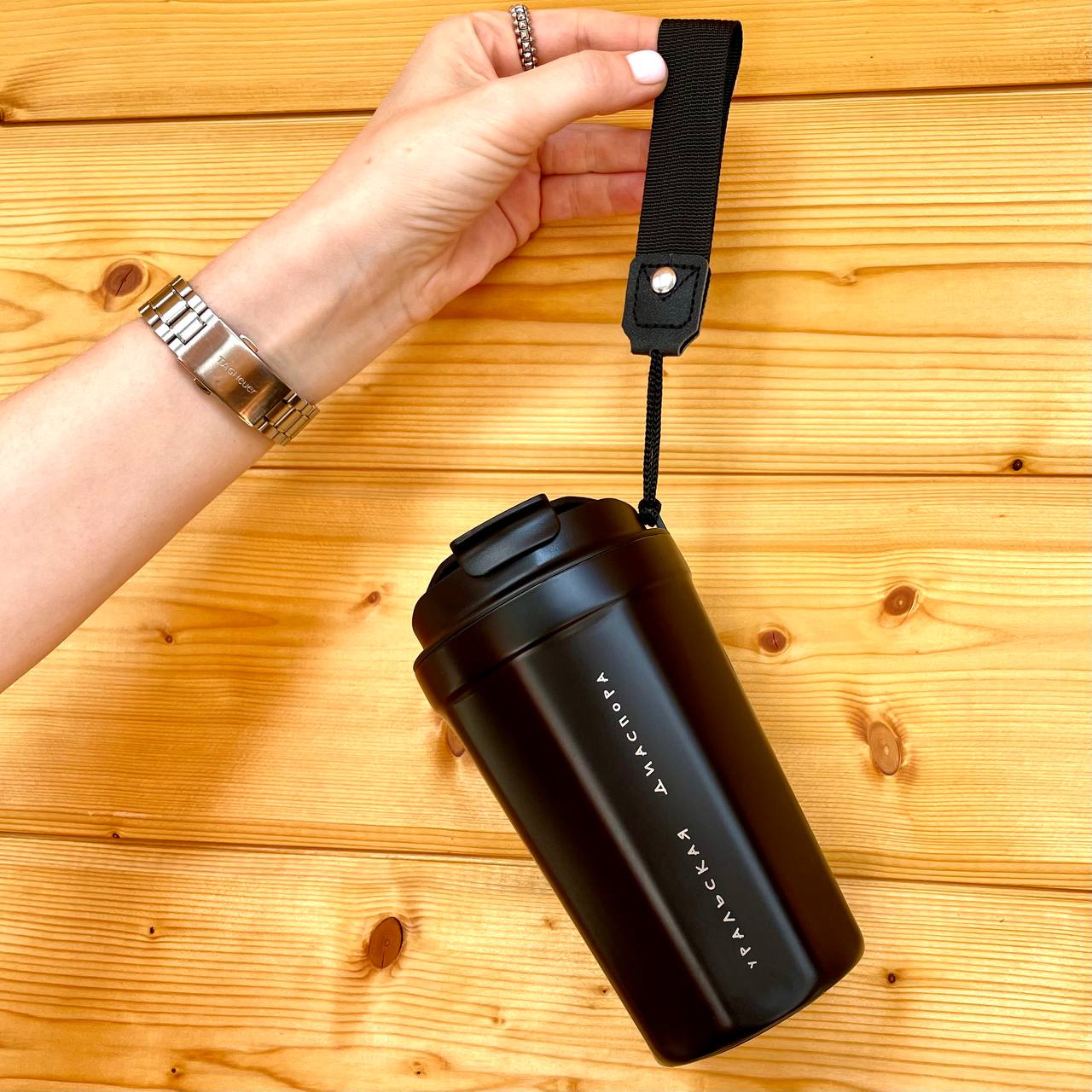 ОписаниеТермокружка с двойными стенками и откидным клапаном для питья